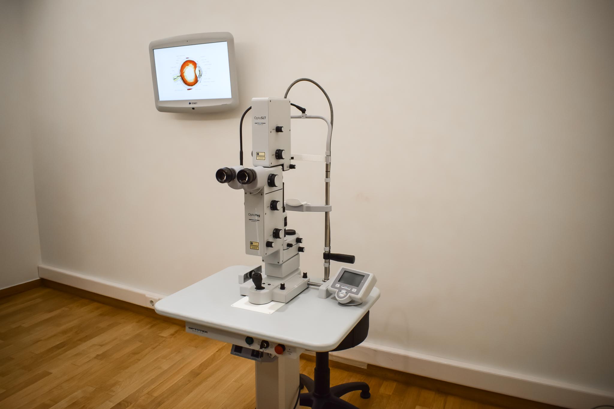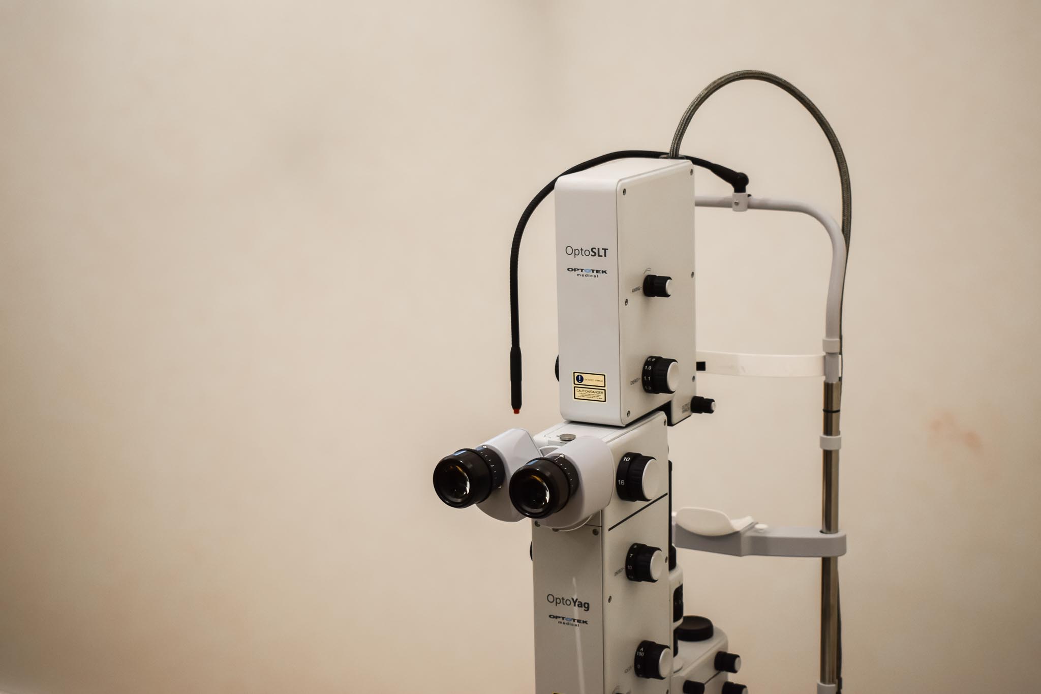 Η Selective Laser Trabeculoplasty (SLT) είναι μια καθιερωμένη μέθοδος οφθαλμικού laser (μήκος κύματος 532 nm), η οποία εφαρμόζεται στο αποχετευτικό σύστημα του οφθαλμού (trabeculum) με σκοπό τη μείωση της ενδοφθάλμιας πίεσης σε ασθενείς με γλαύκωμα. Η συσκευή της εταιρείας OPTOTEK είναι τελευταίας τεχνολογίας, ακριβής και εύχρηστη. Η χαμηλή ένταση των βολών προάγει την λειτουργία των κυττάρων που είναι υπεύθυνα για την αποχέτευση του ενδοφθάλμιου υδατοειδούς υγρού χωρίς να βλάπτει θερμικά τους παρακείμενους ιστούς (εξ ου και εκλεκτική). Η διαδικασία είναι έτσι ασφαλής, ανώδυνη, διάρκειας περίπου δέκα λεπτών, με αποτελεσματικότητα που μπορεί να διαρκέσει έως και 2-3 χρόνια, και μπορεί να επαναληφθεί. Σύμφωνα με πρόσφατες έγκυρες μελέτες εφαρμόζεται και ως αρχική αγωγή, δηλαδή πριν τη χρήση κολλυρίων, ή ως συμπληρωματική της φαρμακευτικής αγωγής. Ωστόσο η επιτυχία της SLT απαιτεί εμπειρία και εξαρτάται από κάποιες παραμέτρους, όπως το στάδιο του γλαυκώματος, το μέγεθος της ενδοφθάλμιας πίεσης, και ανατομικές προϋποθέσεις, που πρέπει να συζητηθούν με τον θεράποντα.